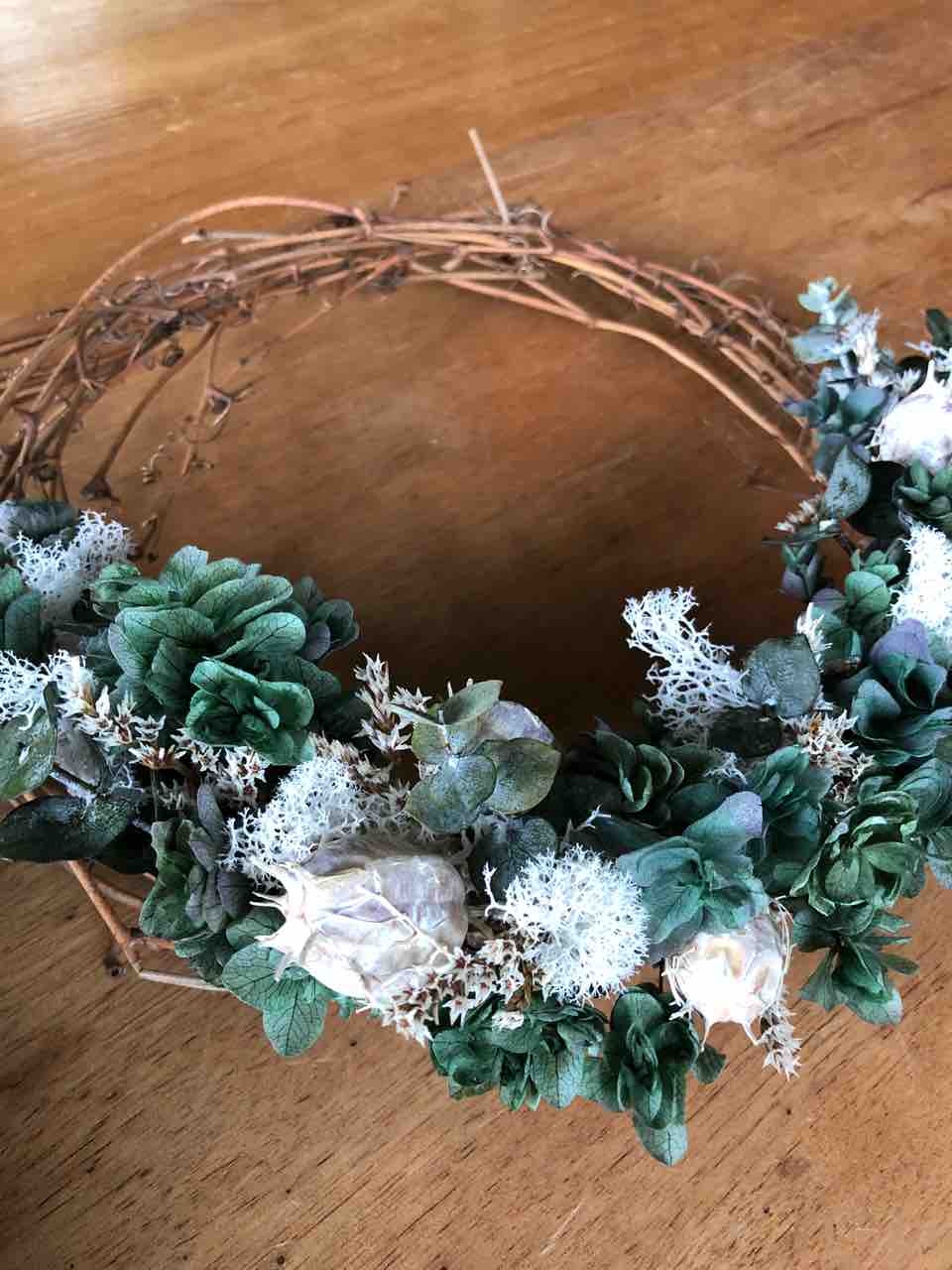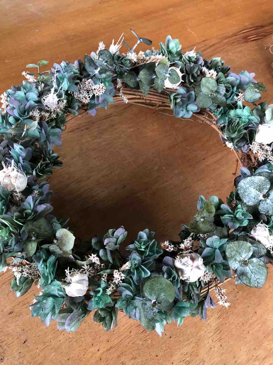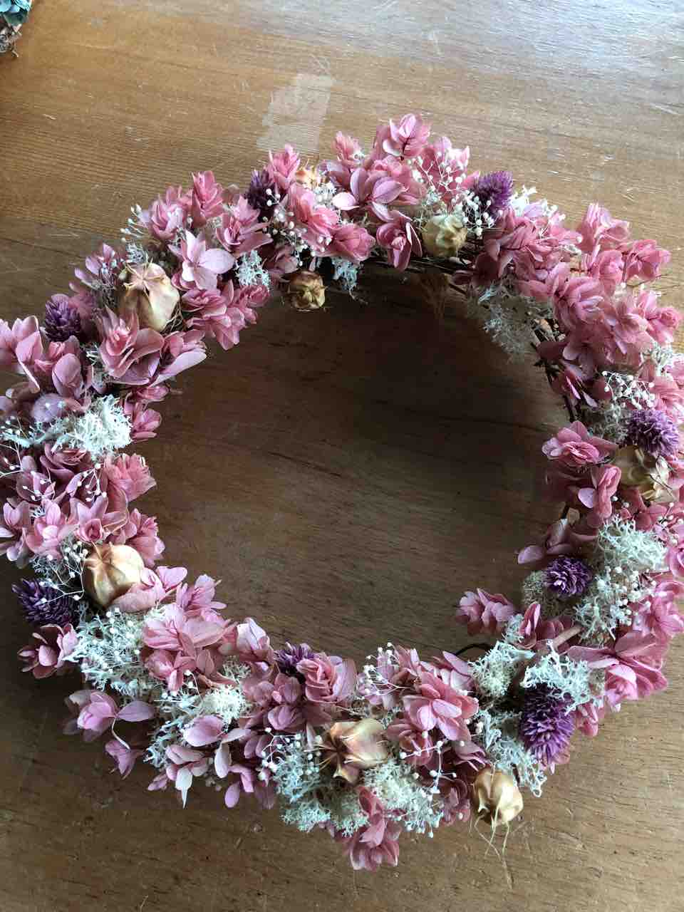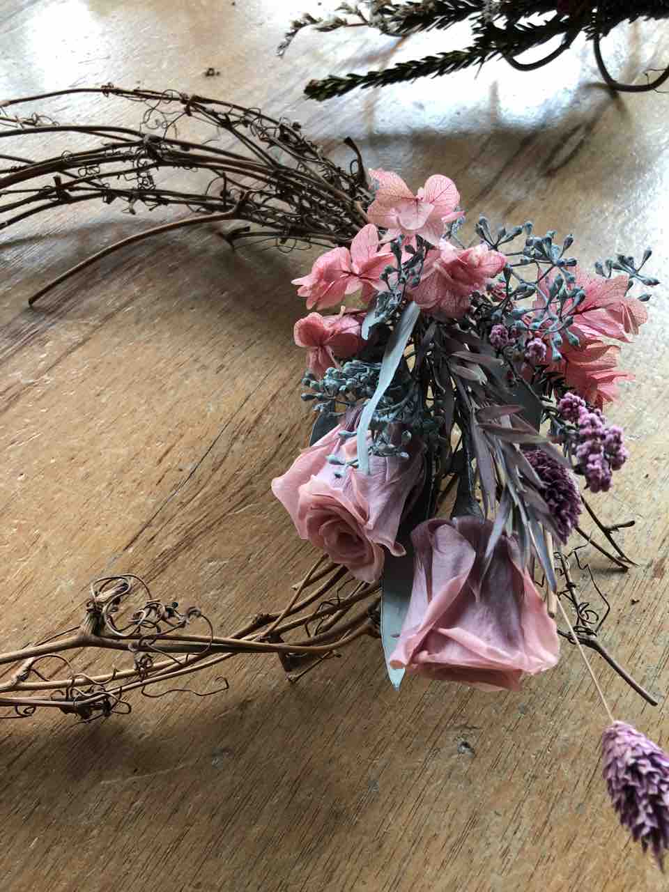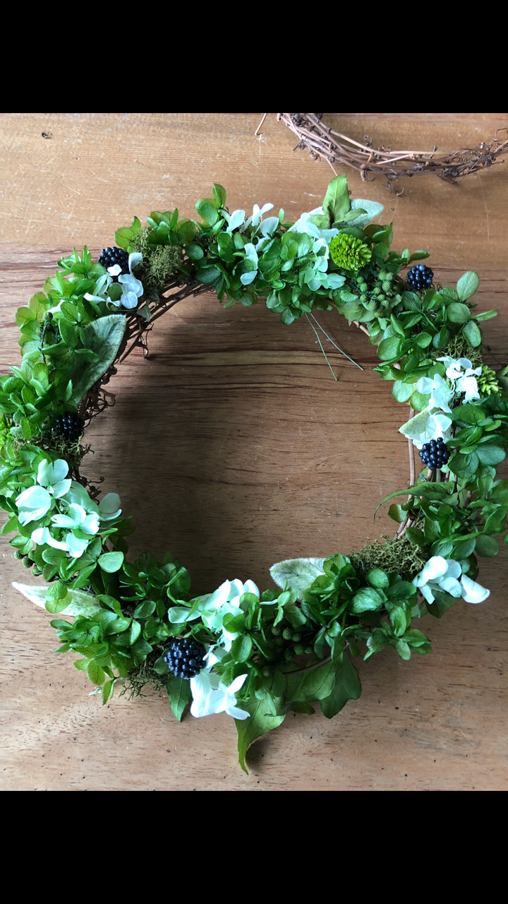 プリザーブドの紫陽花をたっぷり使ったリース 同じくプリザーブドのバラがアクセントのリース