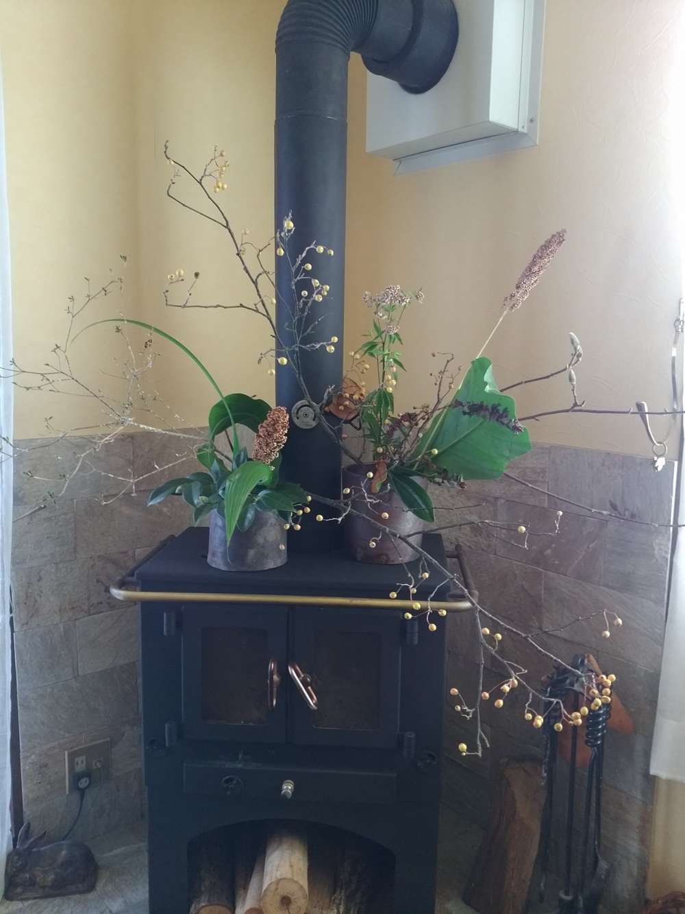 『タイのかご生け』 銀目柳の実 タイサンボクの枝 モクレンの枝 真珠の木原種 フジバカマ ツバキ シランの葉 ポトスの葉ジャンボ 苔ドウダン ガラスに生け変えて… 『一輪差し』 テッセン ノブドウ