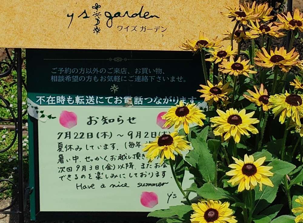 今年は7月22日〜8月31日までの間、夏休みしています!ガーデン店舗は休んでいますが、水やり・剪定・草引き等々お庭作業をしています。見つけたら、声かけてくださいませ。また、お急ぎの方・ご予約来店の方・お庭相談の方のみ対させていただいておりますので、お電話で確認くださいませ。次回、通常オープンは9月3日金曜日からです。それでは、皆様も素敵な夏をお過ごしくださいませ・・・・・ys