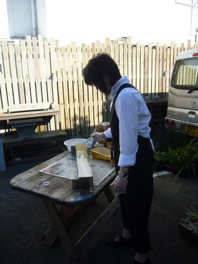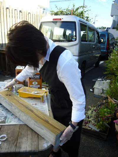 早速のお仕事・・・ なれない手付きの「色付け」です。 プランツたちを入れて飾る木製の箱に色をつけています・・・ 箱は、『made in 店長』です(笑 以前よりも、かなり成長しています。