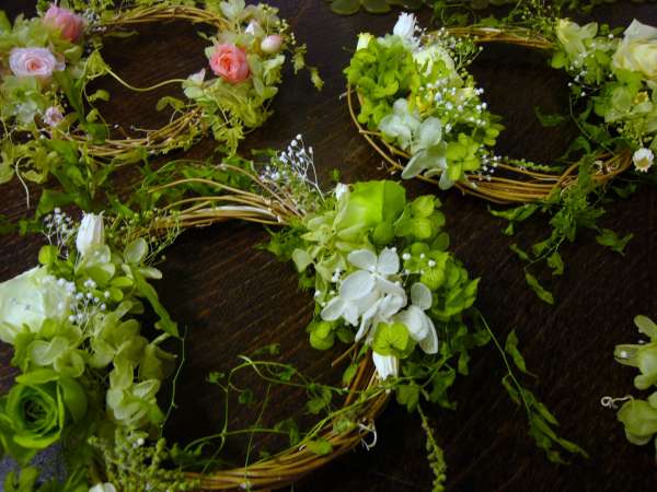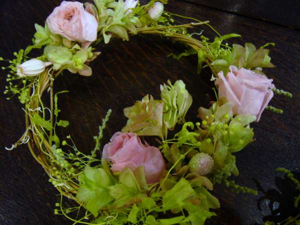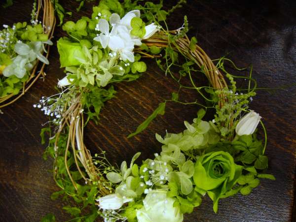 グリーンのアジサイを使った 「ミニリース」 直径は15センチくらいなので、場所を選ばないで、どこでも飾れます!
