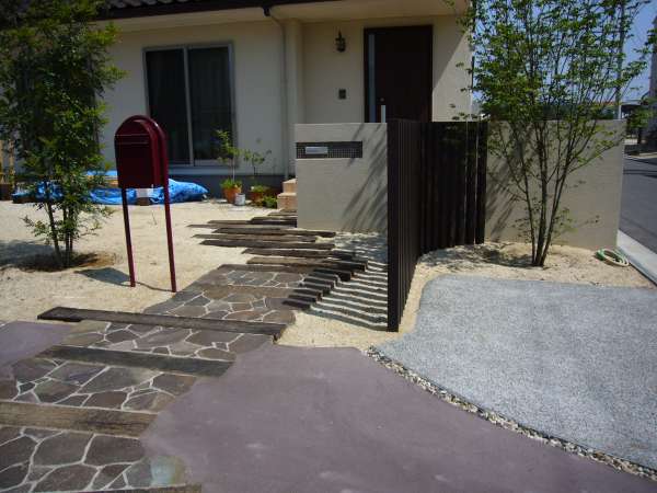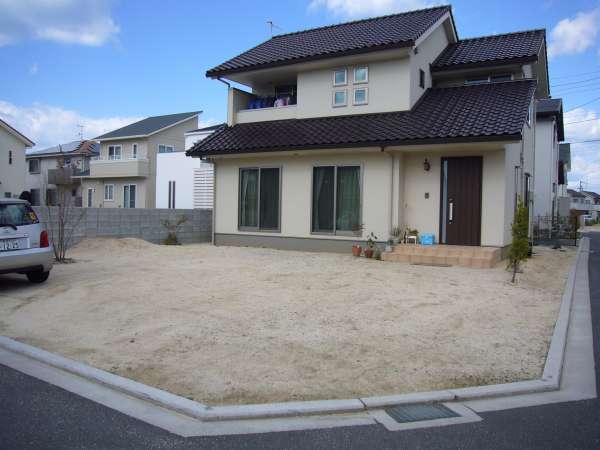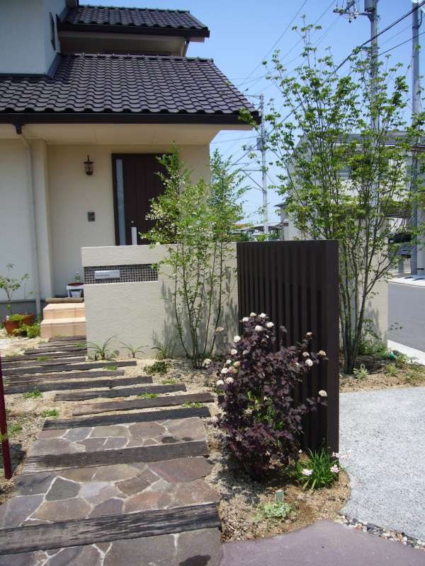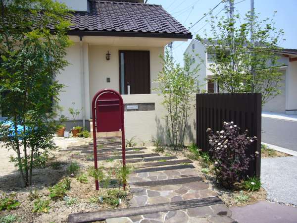 そして、こちらが少し前の写真。 お庭のゾーニングと施工が終わり、樹木類だけでの植栽完了風景です。