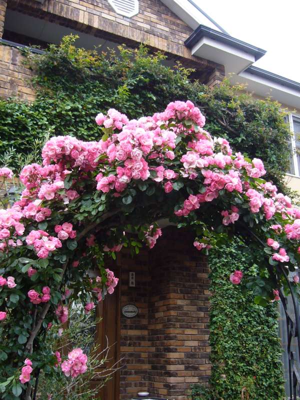 こちらは、玄関に入るアプローチ。 『アンジェラ』の花数を増やすカットテクニックで、 古くなったバラもアーチ本体を隠すほどのボリュームに!